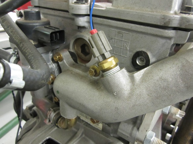 Typical coolant temperature installationWhen an engine starts from cold it is well below its normal operating temperature.  This causes some of the fuel injected into the engine to condense rather than atomising and being drawn in efficiently.  Combustion chamber temperatures are also low which leads to incomplete and slow combustion.  These effects cause the engine to run weak and require extra fuel to be supplied to compensate.  In a conventional system the 'choke' on the carburettor performs this function.  On an injection system a coolant temperature sensor provides the EMS with the engine's temperature and enables it to ‘correct’ the fuelling.  This correction involves adding a percentage of extra fuel according to a predetermined correction profile by temperature, up to the normal operating temperature of the engine.  The amount of extra fuel will vary from engine to engine and according to the engine's temperature and rpm, since the effects of condensing are less when air speeds are higher.