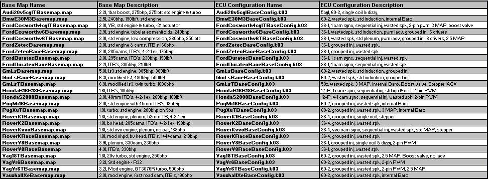 A User Manual, dedicated "ECU Configuration guide" and "Quick start guide" are all supplied in pdf form along with our latest PC software. To see the Base maps & ECU configurations included with a Generic K6+ ECU please click to enlarge the picture above.